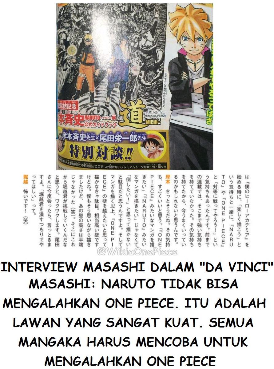 Kutipan wawancara antara Eiichro oda dan Masashi Kishimoto dalam Majalah Jump (Kemungkinan edisi 22.23 iniWawancara lengkap akan tersedia di acara naruto yang akan segera diadakan (di dalam buku Naruto "Michi" ).